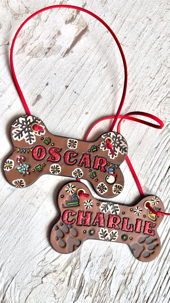 Such a nostalgic little dog bone ornament - with little holiday designs and a glittery name - hung from a red suede lace. I can add a date if you like, each is a little different and you can specify if there are any designs you’d like added to your special piece.