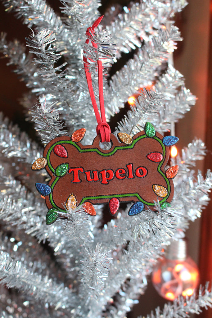 Such a nostalgic little dog bone ornament - with little holiday lights and your pup’s name - hung from a red suede lace.
