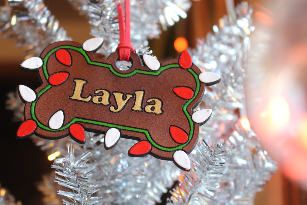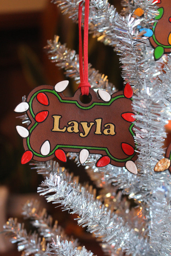 Such a nostalgic little dog bone ornament - with little holiday lights and your pup’s name - hung from a red suede lace.